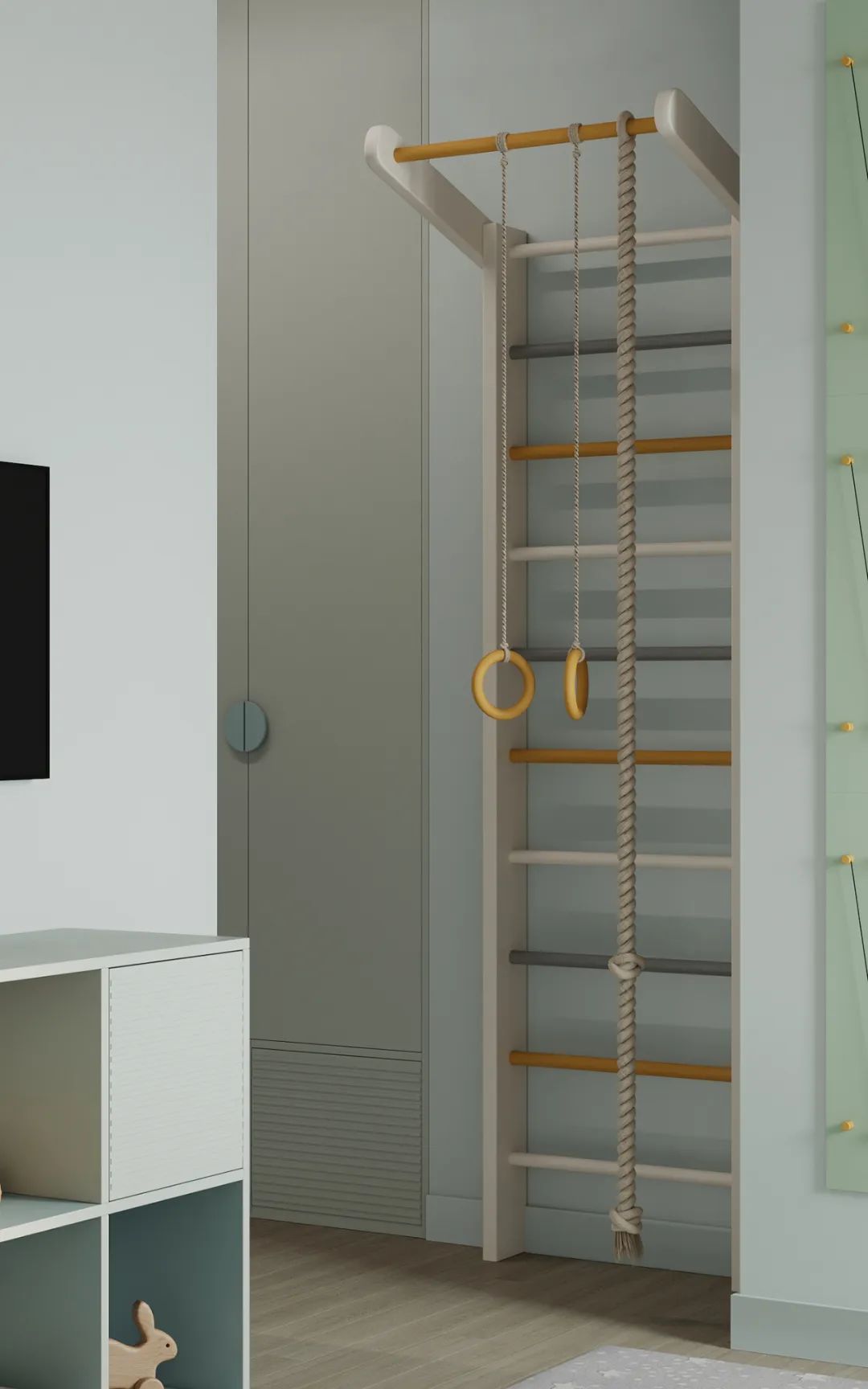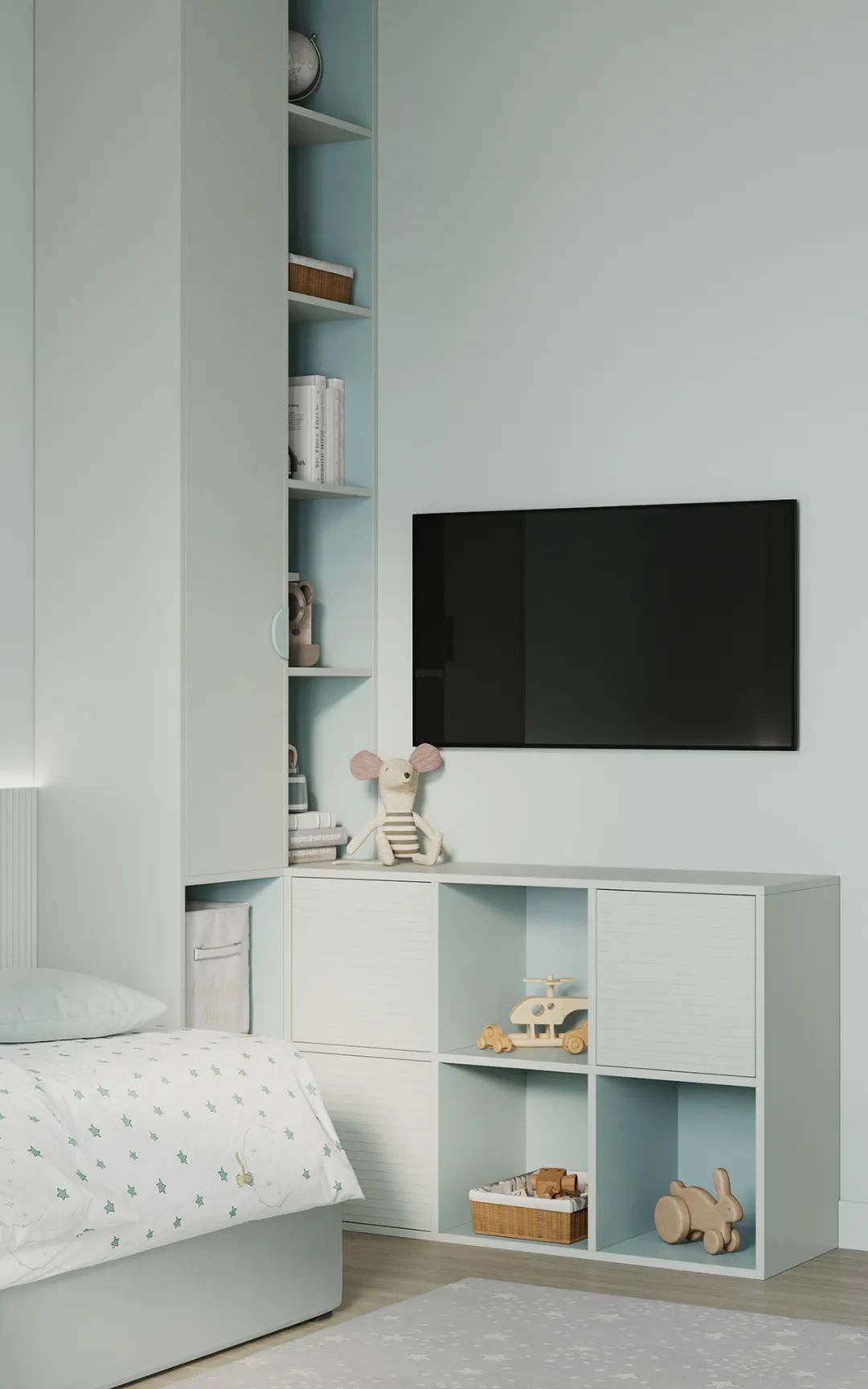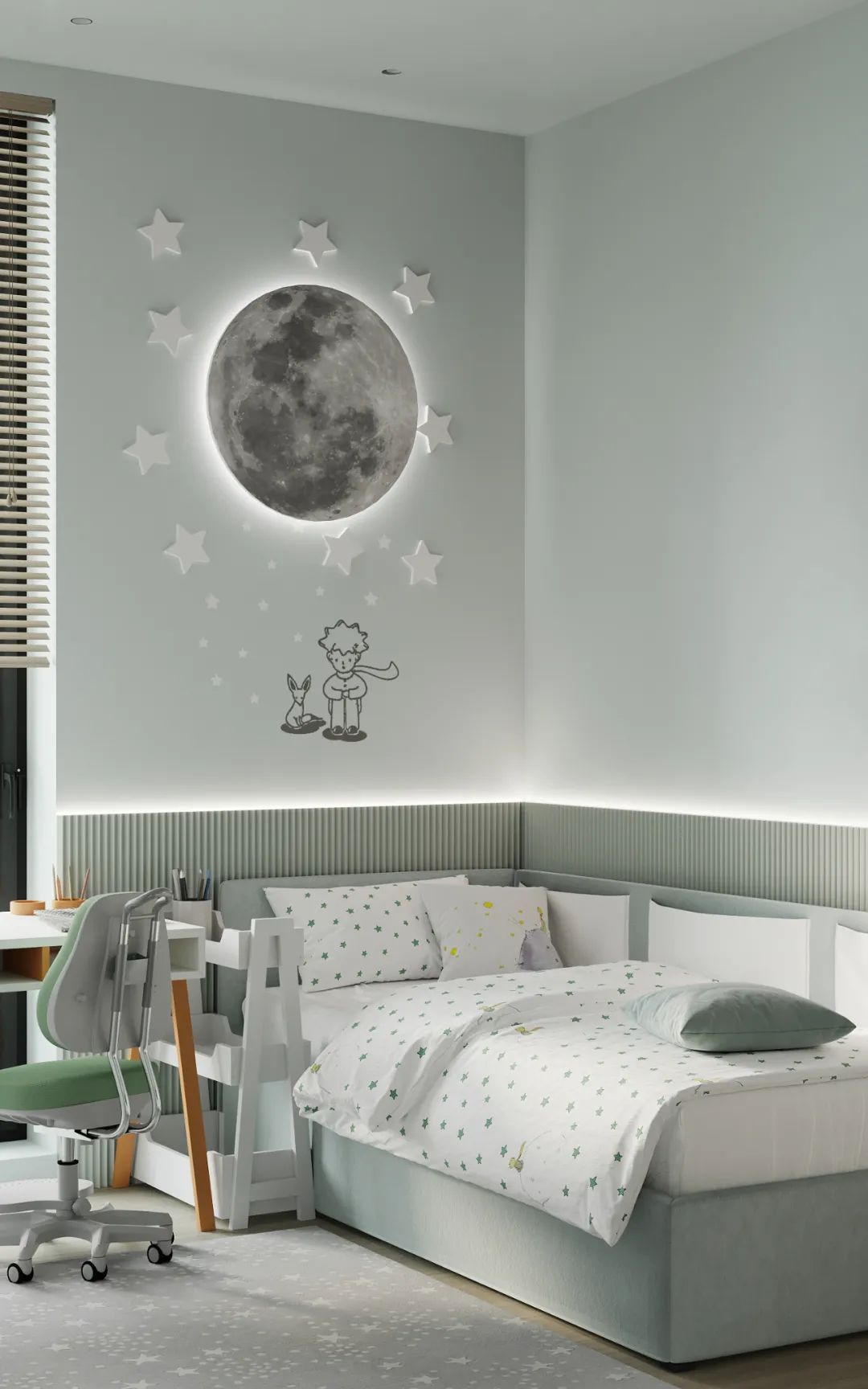 第二间儿童房简约清新的色调,可爱、童趣,具有一定遐想空间的。
