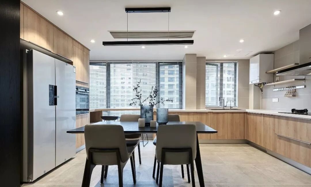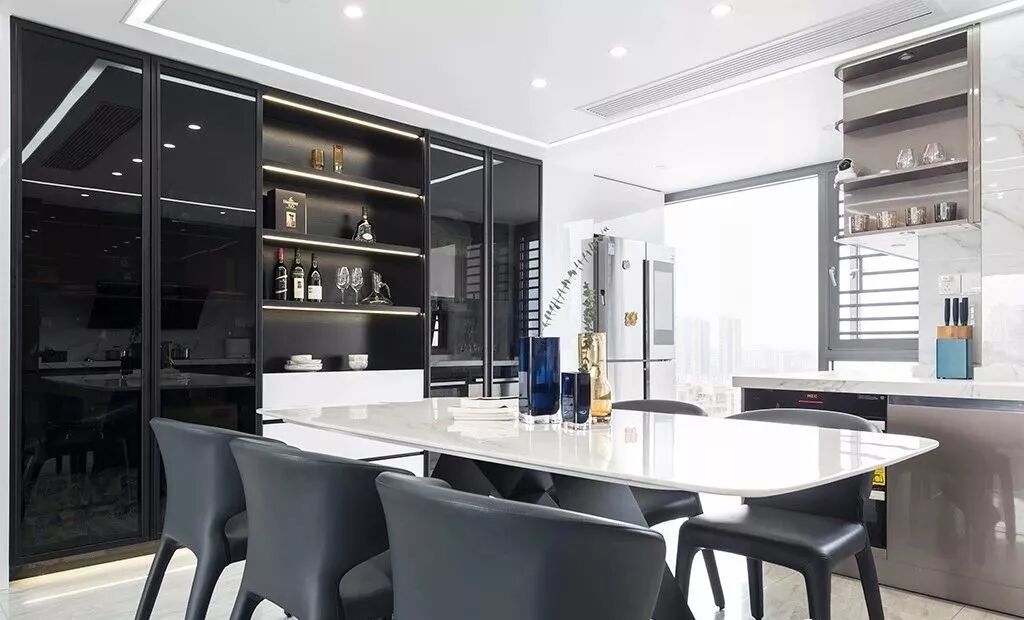 餐厅如果空间比较大的话,也可以融入其他功能,比如现在流行中西厨分离,把油烟区单独隔离,把蒸箱烤箱以及西厨操作台做到餐厅区。