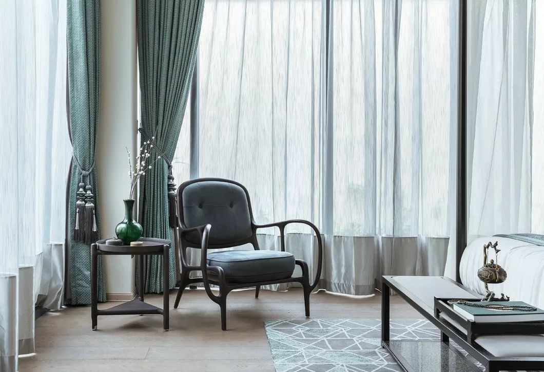 少去了繁复的雕刻花纹,融入线条的写意,让整个空间带有一种中式的美感,融入天圆地方的概念,以一种特别的方式展现出独有的干净利落。空间中运用蓝+绿对比色调,富有层次感,能带来冲击性的视觉效果,令人印象深刻。