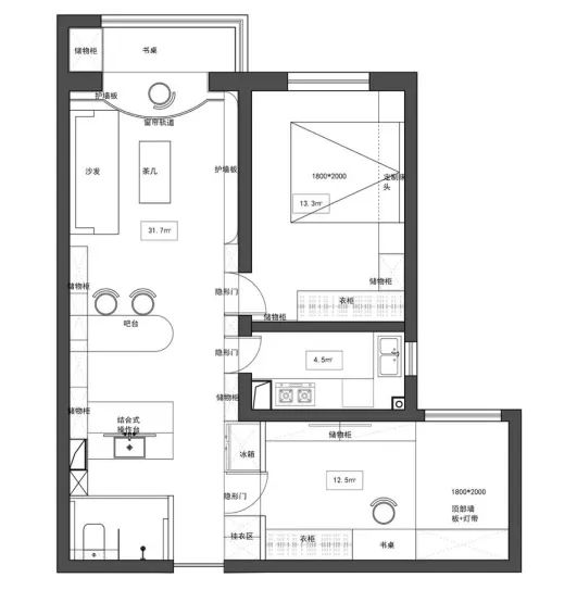 1、玄关区向右侧借了次卧空间,实现了衣鞋等收纳,同时也将冰箱规划在此处;