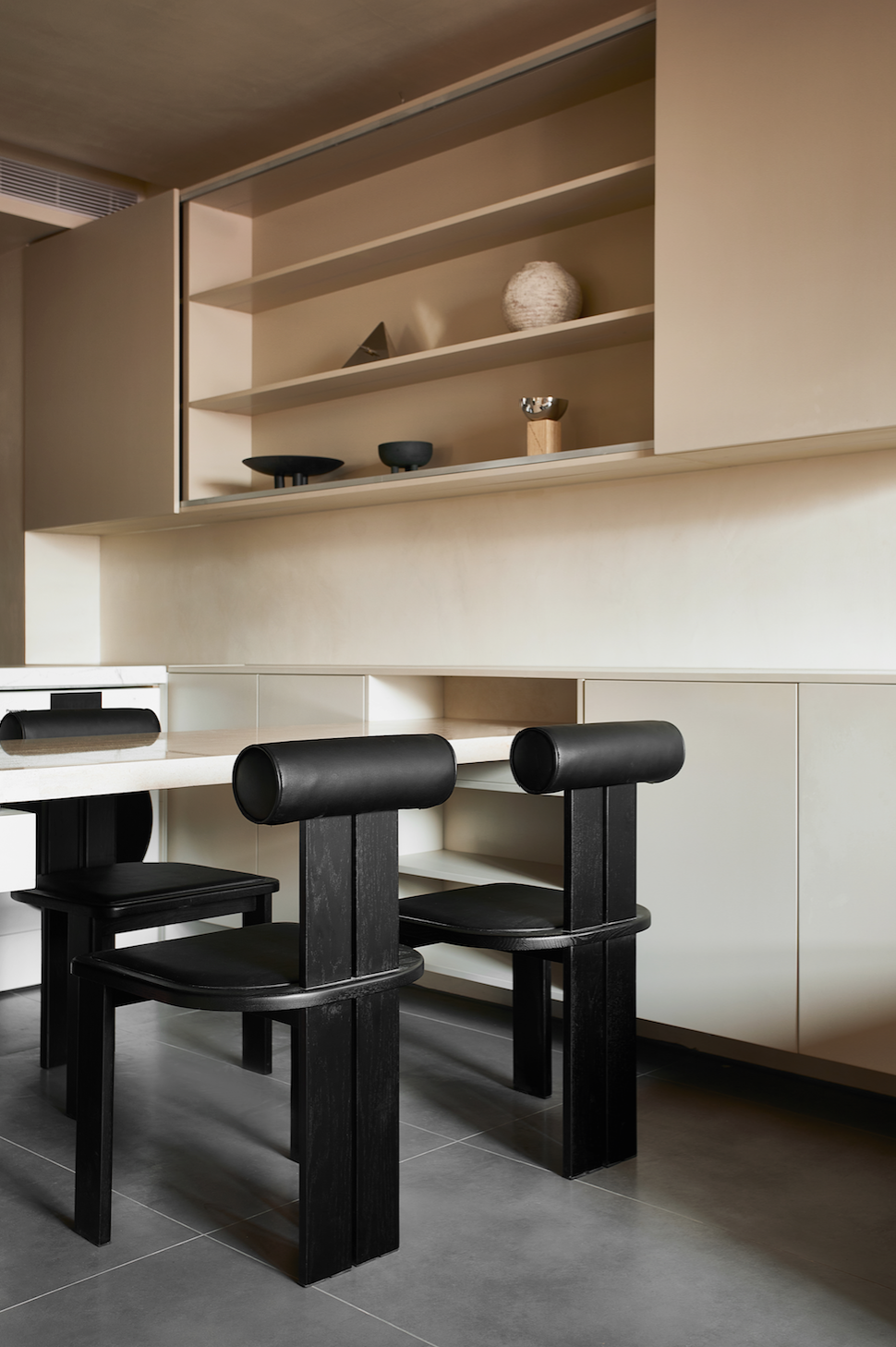 3、餐桌的形式结构与多功能操作台呼应,用横向的体块弱化竖条的空间;