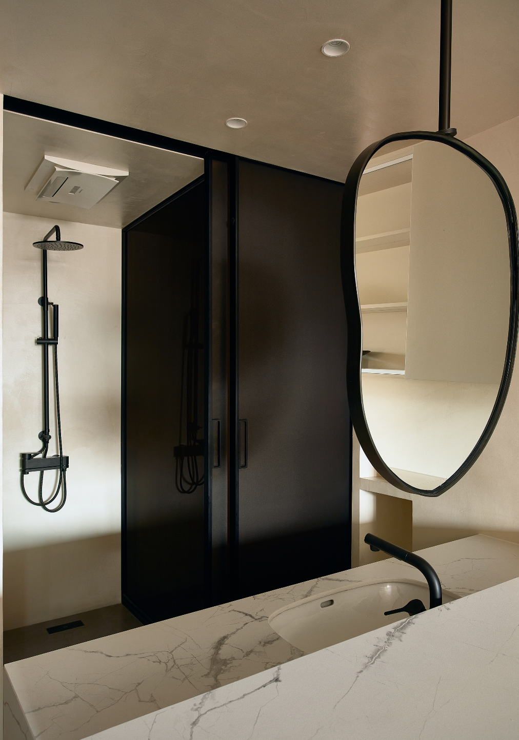 悬吊的水滴型镜子,既是功能区之间的隔断,