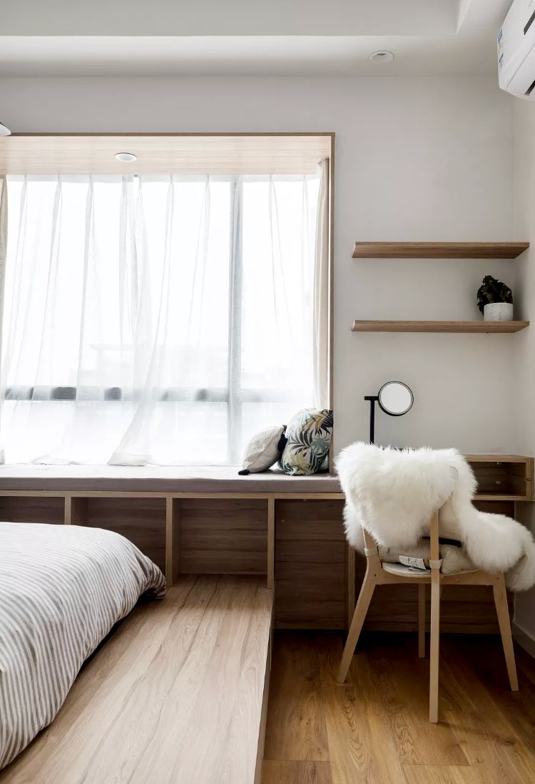借助飘窗与床的距离,横着摆一张书桌,阅读时享受在书中的万千世界,累了就抬头看向窗外大千世界,书与现实相互交叉,仪式感满分!想坐着躺着都很舒服,简直不要太安逸。