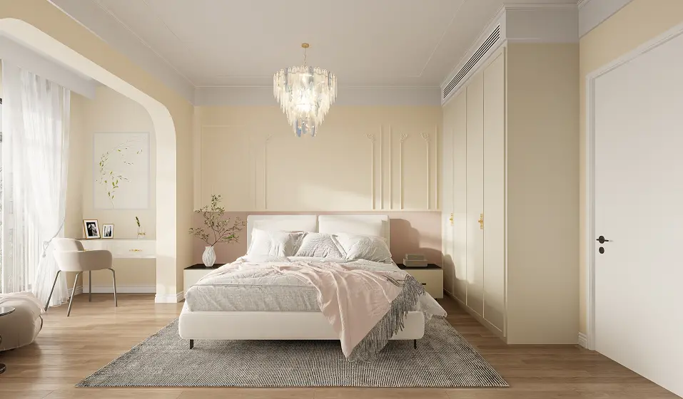 奶油风是马卡龙色系,在暖色系多加白能调出来的,奶油色是一个饱和度很低的颜色,很少女很温馨。因为饱和度很低,所有需要搭配颜色鲜艳的家具,或者绿植放在家中,能在视觉上不会觉得这个房间都被饱和度低的颜色包围。